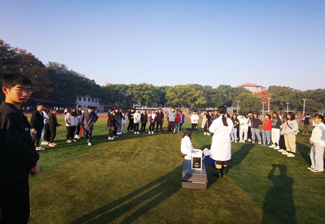 活动伊始,在三位班长的组织下,同学们围成了一个半包围圈,以便宣讲的同学们更好的展示,随后,宣讲团还借来了医公司的假人做急救示范。宣讲团的两位女同学讲解了“C”,“A”,“B”各自的具体含义和意义——从胸外按压,气道开放到人工呼吸的流程和具体操作,并在讲解后现场邀请同学们来做示范。这三个班的同学也积极参加互动,活跃了本次团日活动的氛围。