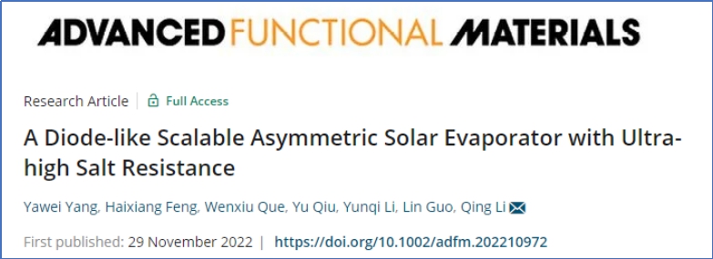 近日,公司李庆教授课题组与西安交通大学杨亚威助理教授等开展合作研究,在国际著名期刊《Advanced Functional Materials》(IF=19.924)上发表了题为“A Diode-like Scalable Asymmetric Solar Evaporator with Ultra-high Salt Resistance”的研究论文。西安交通大学杨亚威助理教授和公司博士研究生冯海翔为该论文的共同第一作者,公司李庆教授为该论文的唯一通讯作者,bevictor伟德为唯一通讯单位。