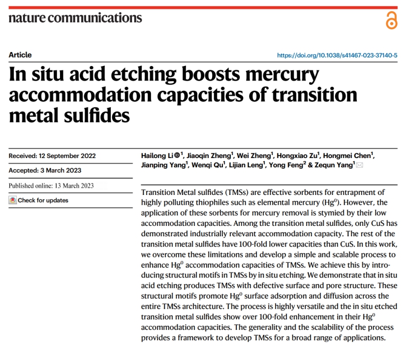 近日,公司李海龙教授课题组在国际顶尖自然指数期刊《Nature Communications》上发表了题为“In situ acid etching boosts mercury accommodation capacities of transition metal sulfides”的研究论文。公司李海龙教授为第一作者,杨泽群副教授为通讯作者,bevictor伟德为第一署名单位和通讯单位。