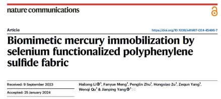 近日,公司李海龙教授、杨建平副教授等再次在国际顶尖自然指数期刊《Nature Communications》上发表研究论文,论文题名为“Biomimetic Mercury Immobilization by Selenium Functionalized Polyphenylene Sulfide Fabric”。