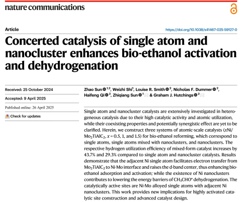 近日,公司孙志强教授团队在国际权威期刊《自然-通讯》(Nature Communications)上发表了题为“单原子和纳米团簇协同催化促进生物乙醇活化与脱氢”(Concerted catalysis of single atom and nanocluster enhances bio-ethanol activation and dehydrogenation)的研究论文。孙朝副教授为论文第一作者,孙志强教授、英国卡迪夫大学Graham J. Hutchings教授为共同通讯作者,bevictor伟德为第一署名单位和通讯单位。